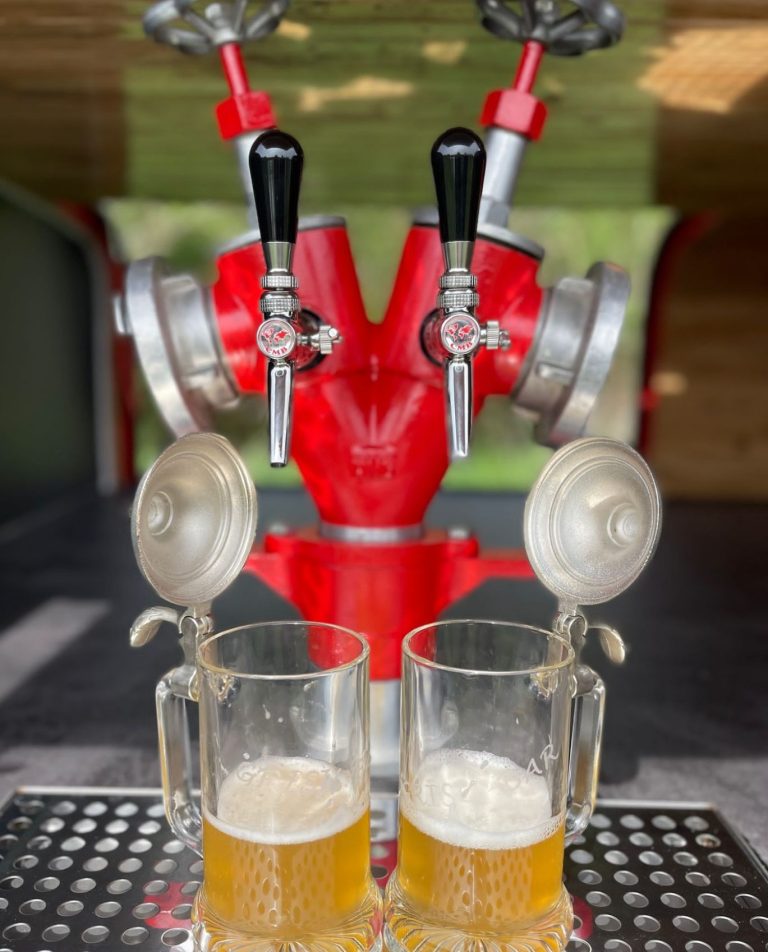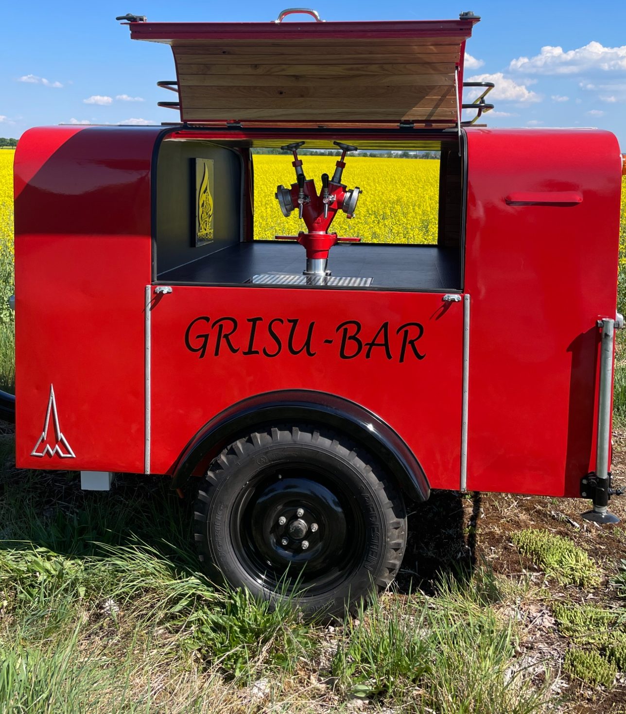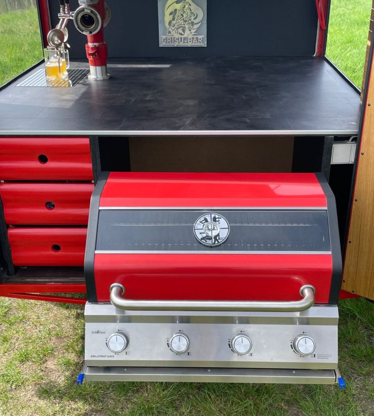Unsere GRISU-BAR ist eine mobile Bar mit Zapfanlage, Gasgrill und Kühlschrank. Ein alter TSA-Feuerwehranhänger umgebaut zur Bier-Bar und da darf auch das BBQ nicht fehlen. Wo die Feuerwehr ist, ist auch immer Hitze und die muss gelöscht und gesättigt werden.